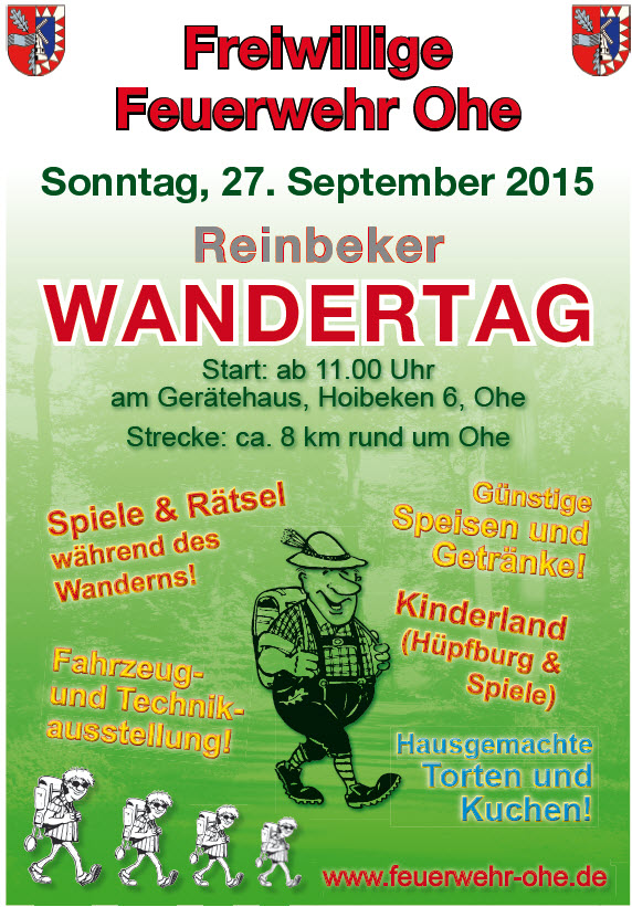 Das nächste Mal schnüren Jung und Alt am Sonntag, 27. September, die Wanderschuhe. Treffpunkt ist ab 11 Uhr an der Feuerwache, Hoibeken 6. Von dort geht es auf die rund acht Kilometer lange Wanderstrecke rund um Ohe. Neben kniffligen Aufgaben und Fragen auf der Strecke, warten im Ziel Preise für die Sieger. Für Stärkung sorgen Getränke und Speisen, wie Currywurst und selbst gebackene Kuchen und Torten. Im Feuerwehrmuseum können die Teilnehmer in die Vergangenheit abtauchen und für die Kleinen steht eine Hüpfburg bereit.