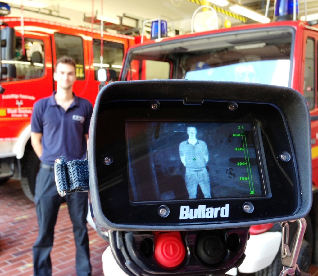 Zusätzlich sendet eine Übertragungseinheit die Bilder zu einem Empfangsbildschirm im Einsatzleitwagen oder zum Gruppenführer, der zusätzlich bei der Orientierung helfen kann.